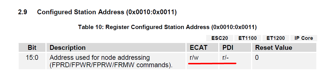 从站地址(ESC寄存器0x10),其复位值为0,主站可写,从站只读,可用于EtherCAT数据帧的寻址功能(固定地址寻址方式)。从站地址在主站对从站网络配置过程中被赋值,从站掉电后数值不保存。调整从站设备在网络中的顺序,其由主站分配的从站地址数值会发生改变。