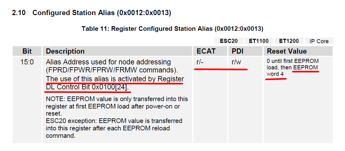 从站地址别名(ESC寄存器0x12),其复位值来自于EEPROM中所存储的数据,主站只读,从站可写。由于主站对该寄存器是只读权限,主站不可直接修改从站别名,但是主站可以更新从站EEPROM中用于从站地址别名的数据,之后重启从站,新的从站地址别名就会从EEPROM中加载到ESC寄存器0x12, 实现主站更新从站地址别名。通过EEPROM保存的从站地址别名,从站掉电也能保存,从站地址别名不随从站在网络中的位置变化而变化。从站地址别名同样可以用于EtherCAT数据帧的寻址功能(固定地址寻址方式, 须由主站设置ESC寄存器0x100[24]后启用)。