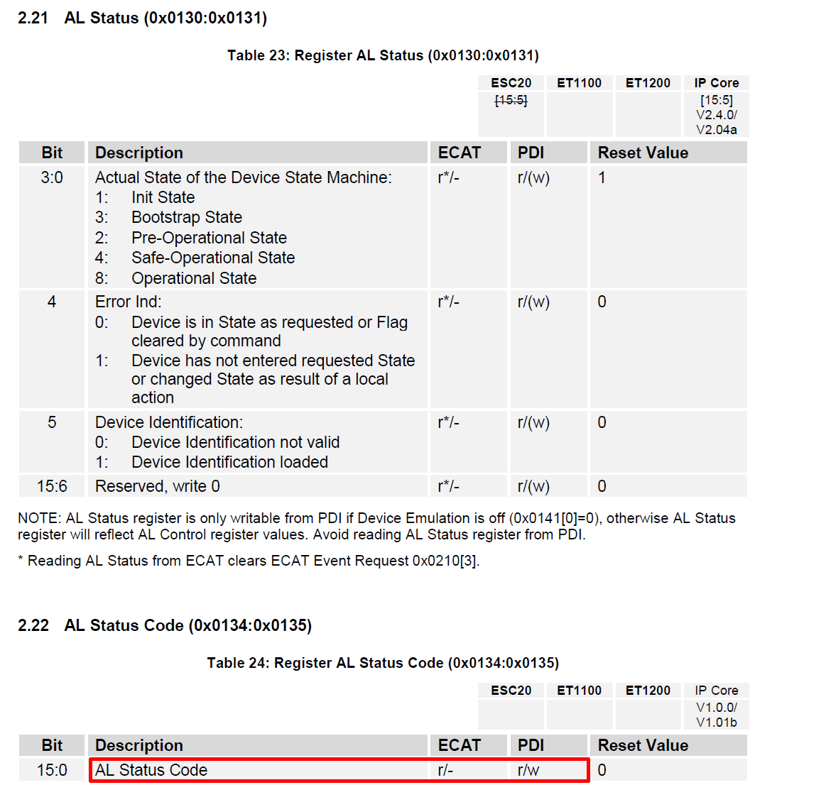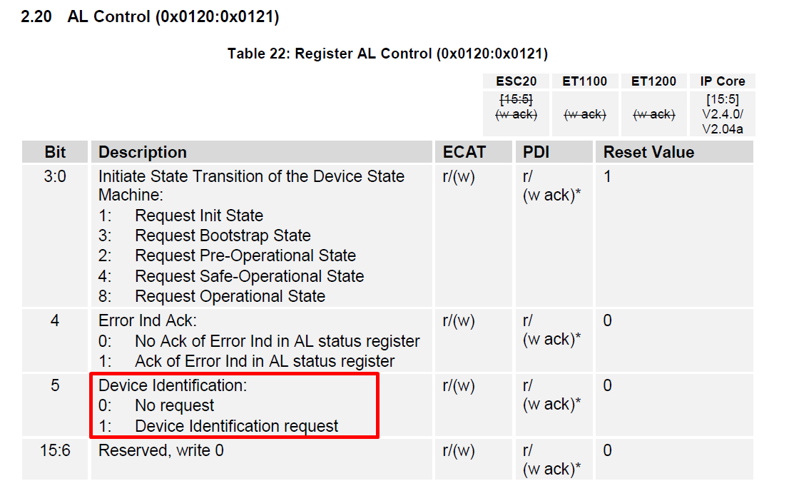 不同于从站地址和从站地址别名直接存在在ESC的寄存器中,主站可直接读取寄存器设置或获取属性值,读取Explicit Device ID需要主站写寄存器0x120请求从站反馈Explicit Device ID,之后从站软件相应请求将APPL_GetDeviceID()获取的返回值写入寄存器0x134, 最后主站读取寄存器0x134获取从站Explicit Device ID。
