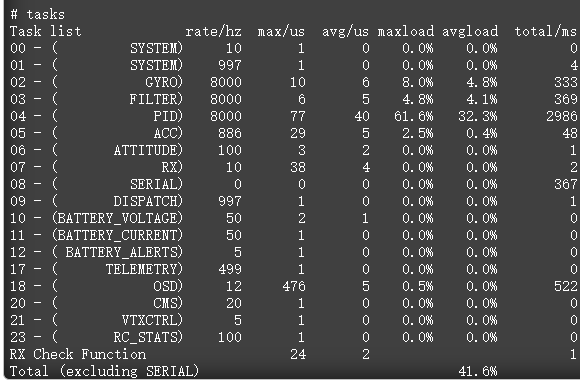 在典型环境下,即IMU@8k采样率,4路dhsot600电调(未使用回传),外接CRSF接收机,外接IRC协议图传,采样电池电压的情况下: